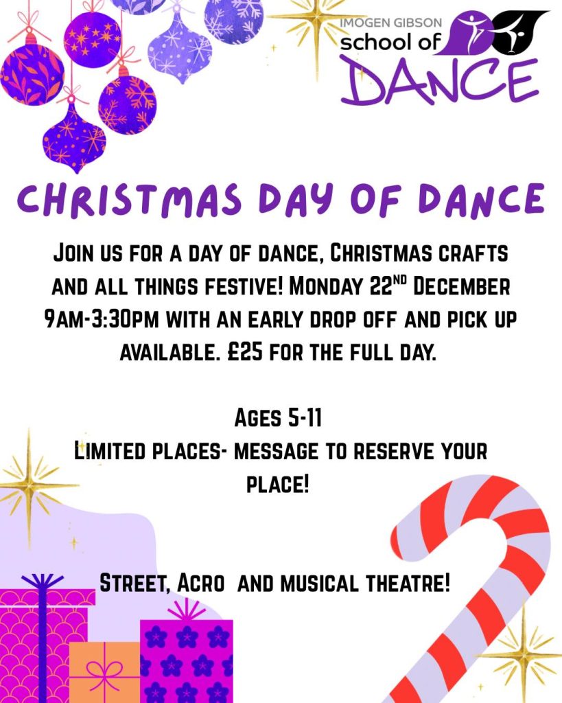 We are now taking names for our Christmas Day of Dance! What better way to get into the Christmas spirit! Perfect for those parents that are still working or for those that need to get their shopping! Let us entertain the children with lots of fun dancing, crafting and games! Message to reserve your place!