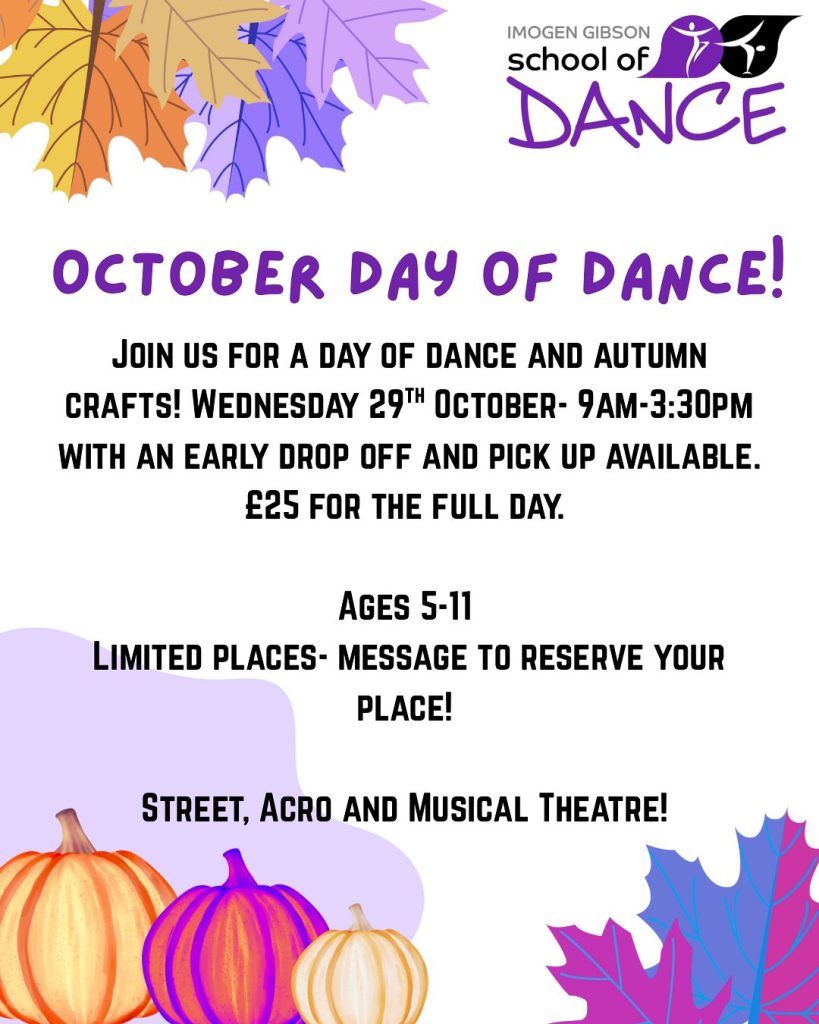 Just a reminder of dates for your diaries! We are now taking names for our two days of dance! Wednesday 29th October & Monday 22nd December! More information will be released by the end of the week!